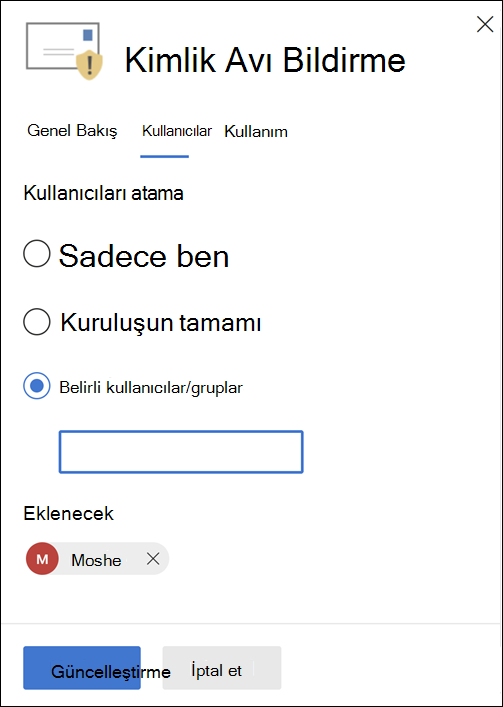Ayrıntılar açılır öğesinin Kullanıcılar sekmesinde, Kullanıcı ata bölümünde Belirli kullanıcılar/gruplar'ın seçili olduğunu doğrulayın.