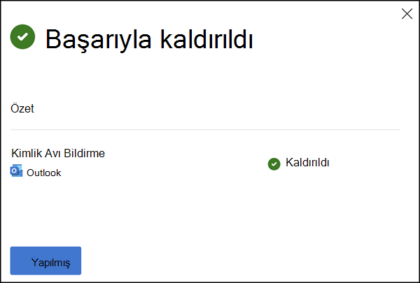 Birkaç dakika sonra başarıyla kaldırılan açılır öğe görüntülenir. Eklentinin kuruluşunuzdan kaybolması 24 saat kadar sürebilir.