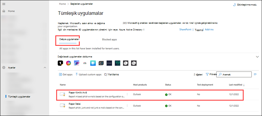 Tümleşikuygulamalar sayfasının Dağıtılan uygulamalar sekmesinde, aşağıdaki adımlardan birini yaparak Rapor İletisi eklentisini veya Rapor Kimlik Avı eklentisini seçin: