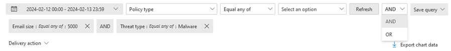 Özellik filtreleri (sorgular):Görünümdeki sonuçları kullanılabilir iletiye, dosyaya veya tehdit özelliklerine göre filtreleyin. Kullanılabilir filtrelenebilir özellikler görünüme bağlıdır. Bazı özellikler birçok görünümde kullanılabilirken, diğer özellikler belirli bir görünümle sınırlıdır.