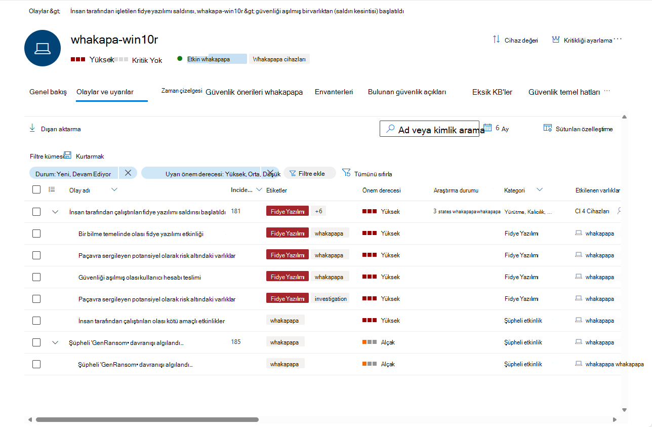 Olaylar ve uyarılar sekmesi, eklendiyse Microsoft Sentinel dahil olmak üzere bir dizi Microsoft Defender algılama kaynağından cihazda tetiklenen uyarıları içeren olayların listesini içerir. Bu liste , olay kuyruğunun filtrelenmiş bir sürümüdür ve olay veya uyarının kısa bir açıklamasını, önem derecesini (yüksek, orta, düşük, bilgilendirici), kuyruktaki durumunu (yeni, devam ediyor, çözüldü), sınıflandırmasını (ayarlanmamış, yanlış uyarı, doğru uyarı), araştırma durumunu, kategoriyi, bu durumu ele almak için atananları ve gözlemlenen son etkinliği gösterir.