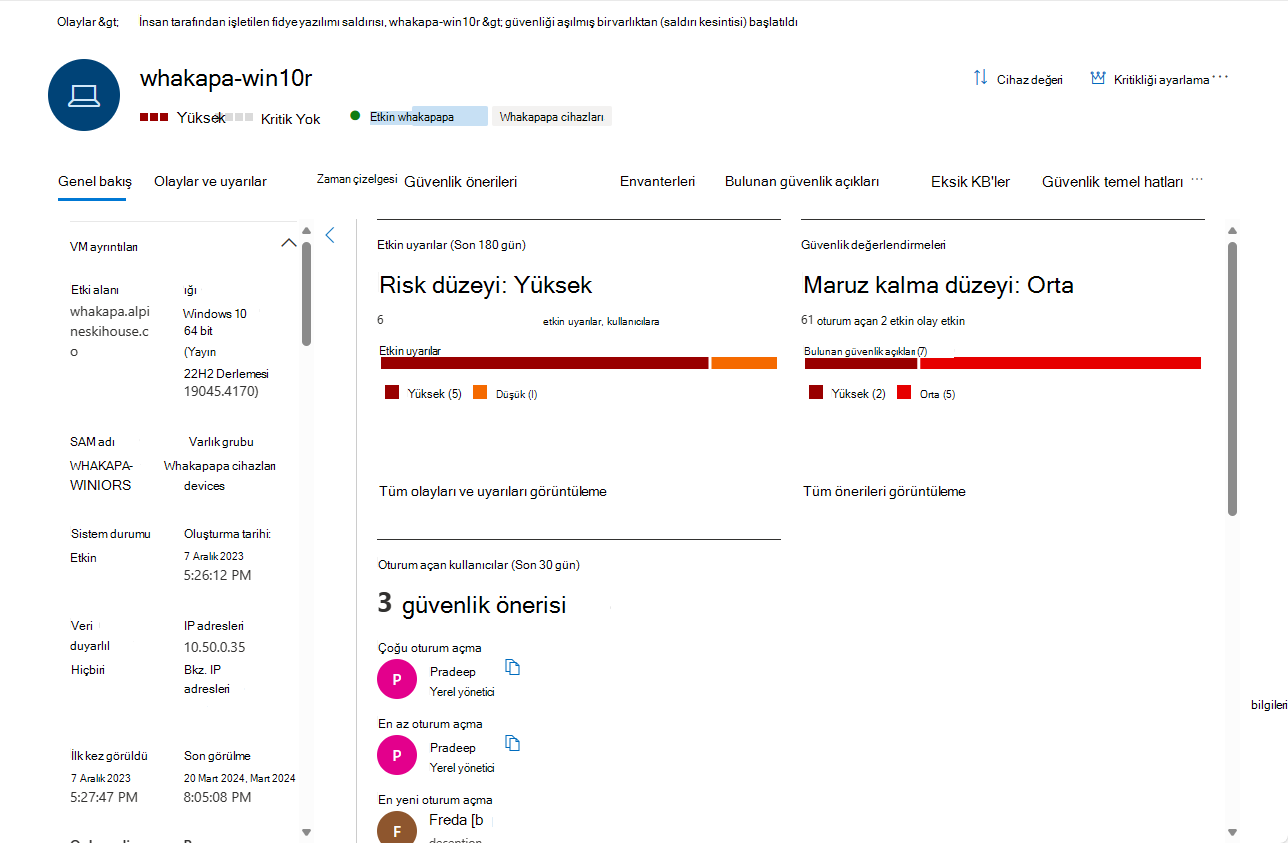 Cihaz varlığı sayfasında görüntülenen içerik kümesi, cihazın Uç Nokta için Microsoft Defender ve Kimlik için Microsoft Defender kaydına bağlı olarak biraz farklılık gösterebilir.