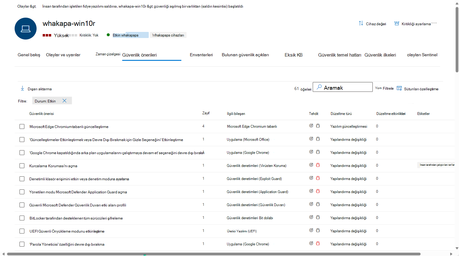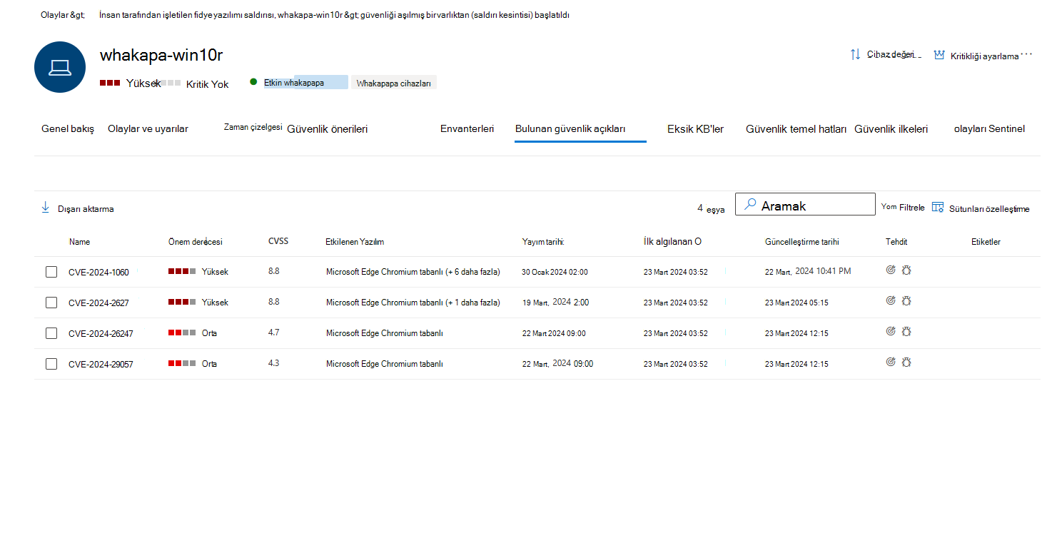 Önceki sekmelerde olduğu gibi, görüntülenecek sütunların seçimi özelleştirilebilir. Liste önem derecesine, tehdit durumuna, cihazın açığa alınmasına ve etiketlere göre filtrelenebilir.