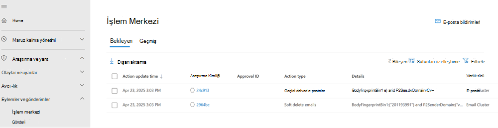 Kuruluşunuz için otomatik araştırma ve yanıt özelliklerinin nasıl yapılandırıldığına bağlı olarak, düzeltme eylemleri otomatik olarak veya yalnızca güvenlik operasyonları ekibinizin onayıyla gerçekleştirilen işlemlerdir. Bekleyen veya tamamlanan tüm eylemler, cihazlarınız, e-posta & işbirliği içeriği ve kimlikleri tek bir konumda bekleyen ve tamamlanan düzeltme eylemlerini listeleyen İşlem merkezinde listelenir.