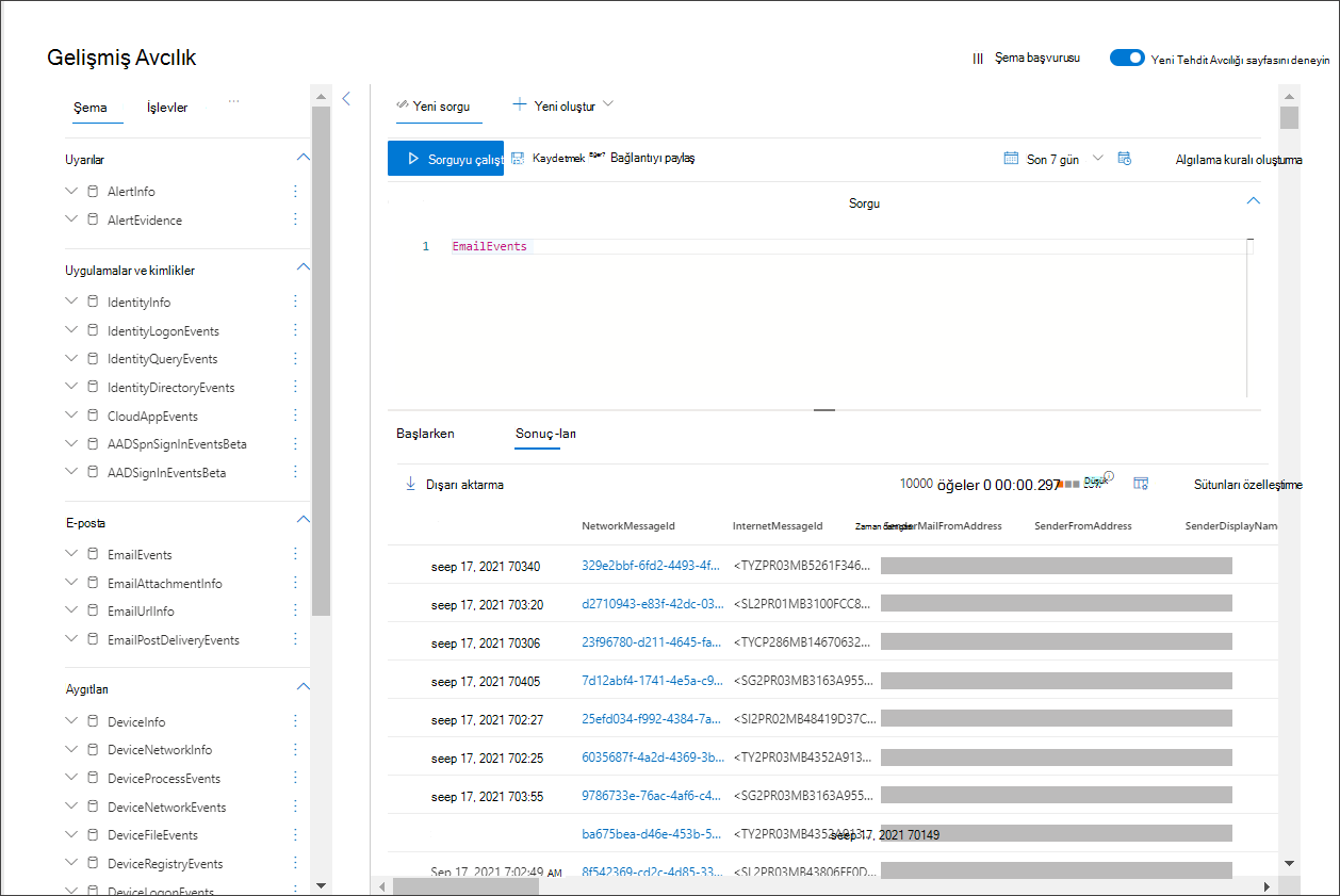 EmailEvents | where SenderMailFromDomain == "yahoo.com"Kaydı inceleyebilmeniz için sorgudan elde edilen satırları seçin.