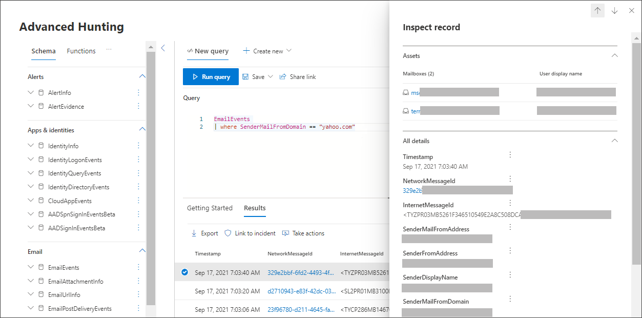 Sonuçlara bakın ve açtığınız e-postayı tanımlayıp tanımlayabildiğinize bakın. İletinin gelişmiş avcılıkta görünmesi iki saat kadar sürebilir. Sonuçları daraltmak için sorgunuza where koşulunu ekleyerek yalnızca SenderMailFromDomain olarak "yahoo.com" olan e-postaları arayabilirsiniz. İşte bir örnek.