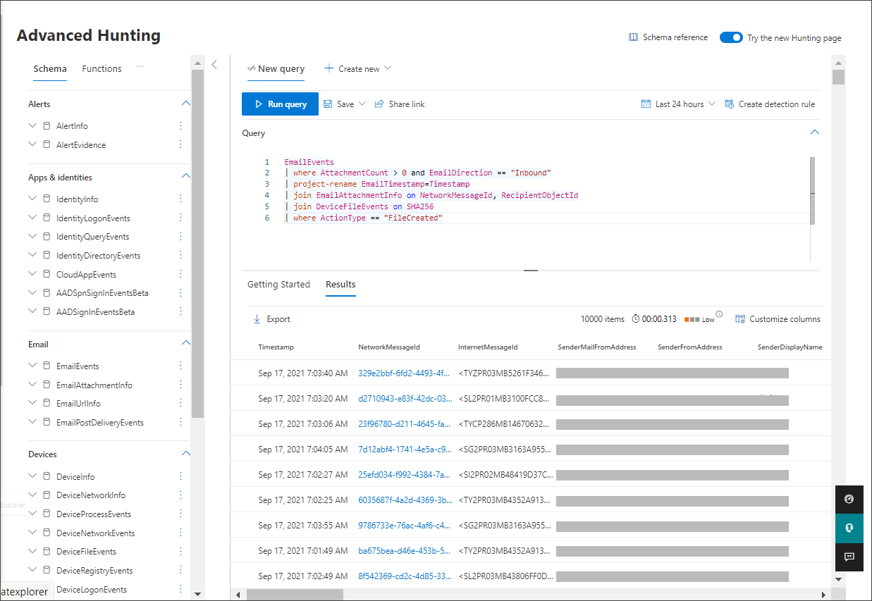 EmailEvents | where AttachmentCount > 0 and EmailDirection == "Inbound" | project-rename EmailTimestamp=Timestamp | join EmailAttachmentInfo on NetworkMessageId, RecipientObjectId | join DeviceFileEvents on SHA256 | where ActionType == "FileCreated"Şimdi kullanıcının eki açtığı veya kaydettiği tüm gelen e-postaları tanımlayan bir sorgu oluşturdunuz. Ayrıca bu sorguyu belirli gönderen etki alanları, dosya boyutları, dosya türleri vb. için filtrelemek üzere daraltabilirsiniz.