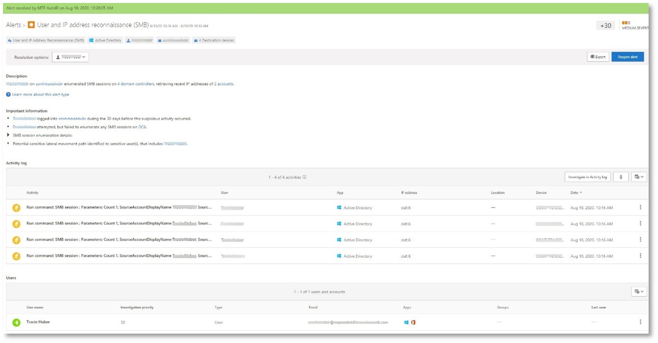 Örneğin, Kullanıcı ve IP adresi keşfi (SMB) uyarısında yer alan bilgilere dayanarak, tabloyu kullanarak IdentityDirectoryEvents tüm SMB oturum numaralandırma olaylarını bulabilir veya tabloyu kullanarak IdentityQueryEvents Kimlik için Microsoft Defender verilerdeki diğer çeşitli protokollerde daha fazla bulma etkinliği bulabilirsiniz.