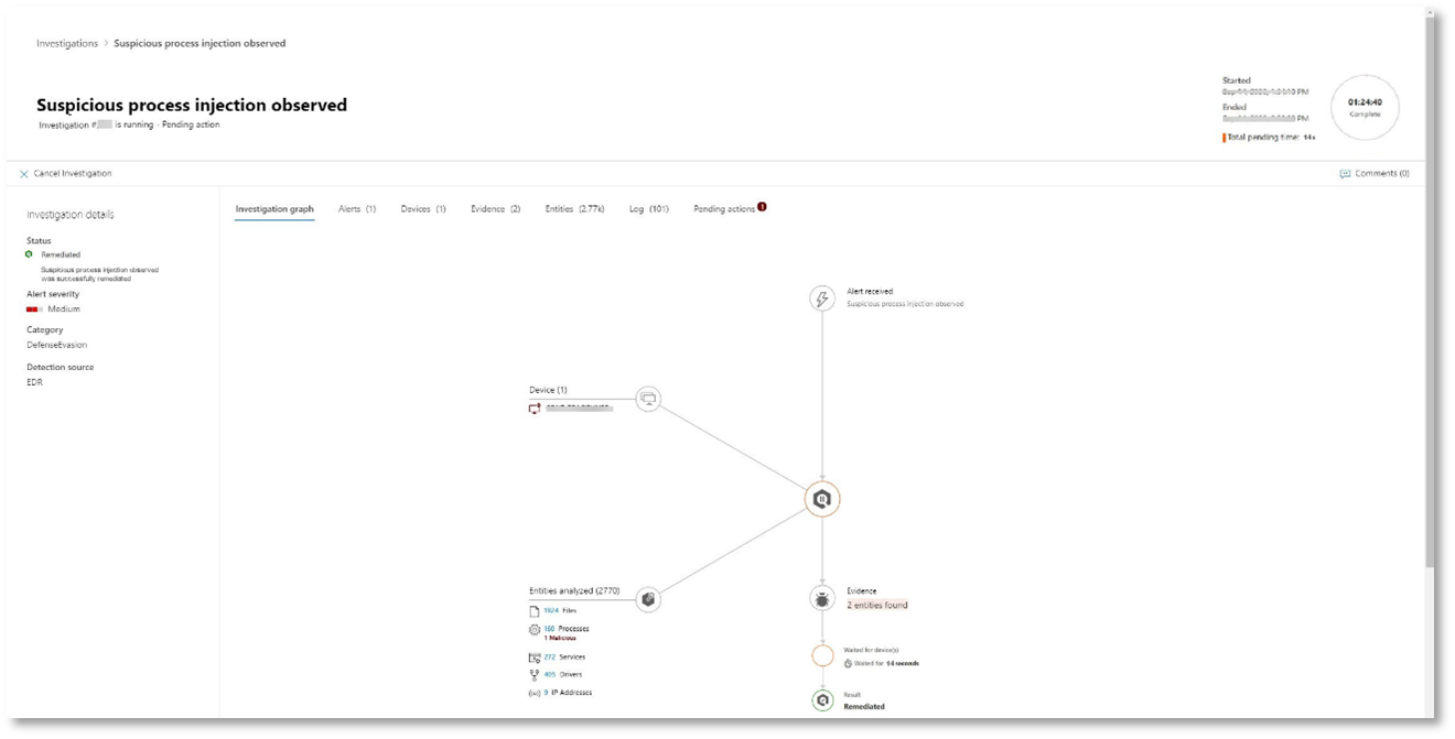 Otomatik araştırma sırasında, Uç Nokta için Microsoft Defender düzeltme gerektiren yapıtlardan biri olarak eklenen notepad.exe işlemini tanımladı. Uç Nokta için Defender, otomatik düzeltmenin bir parçası olarak şüpheli işlem ekleme işlemini otomatik olarak durdurur.
