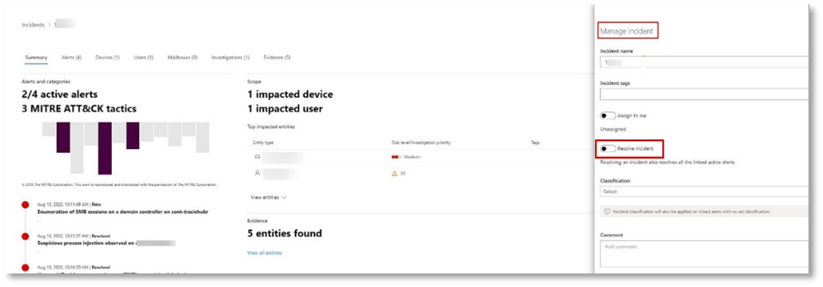 Olay çözümlendiğinde, Microsoft Defender portalında ve ilgili portallarda ilişkili tüm uyarıları çözümler.