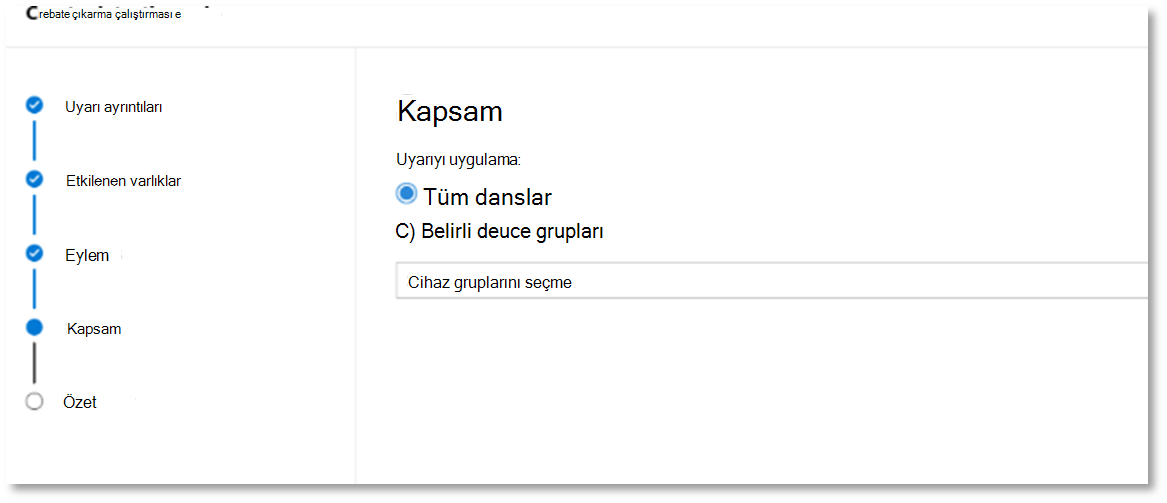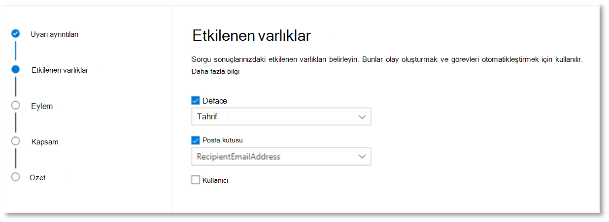 Bu uyarıda hangi varlıkların etkilendiğini seçin. Bu durumda Cihaz ve Posta Kutusu'ni seçin.