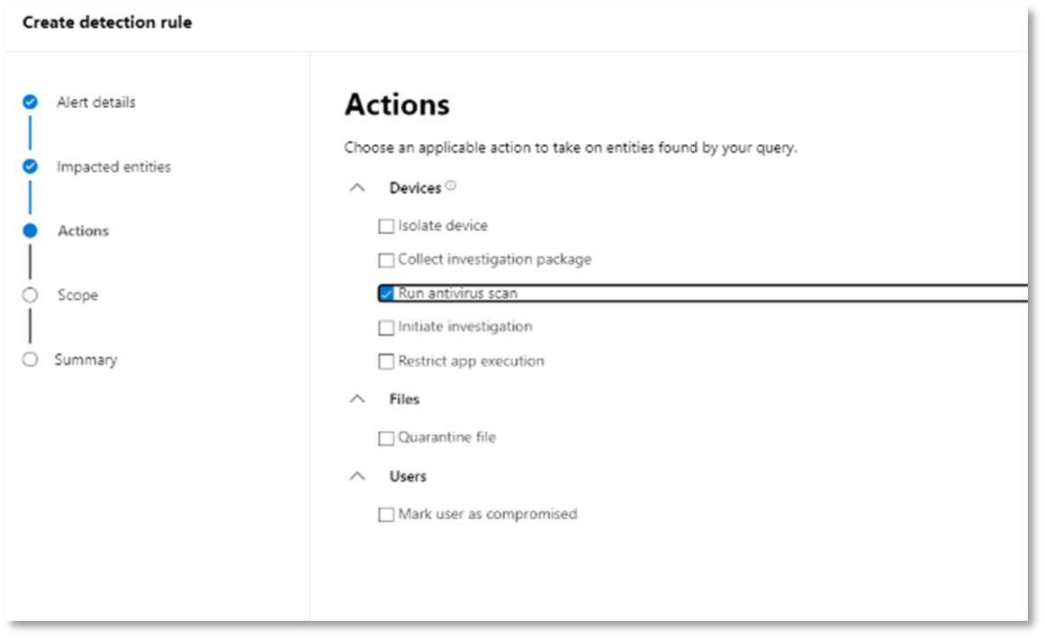 Uyarı tetiklendiğinde gerçekleştirilecek eylemleri belirleyin. Bu durumda, başka eylemler gerçekleştirilebilse de bir virüsten koruma taraması çalıştırın.