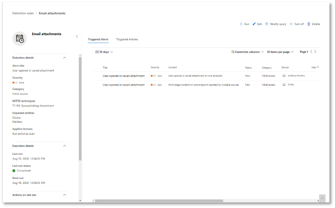 Özel algılamalar, ayarladığınız sıklığa göre sorguyu çalıştırır ve sorguların sonuçları, seçtiğiniz etkilenen varlıklara göre güvenlik uyarıları oluşturur. Bu uyarılar olaylarla ilişkilendirilecek ve ürünlerden biri tarafından oluşturulan diğer güvenlik uyarıları olarak önceliklendirilebilir.