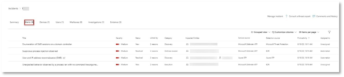 - Kanıt listesi. Dosyalar, işlemler, hizmetler, sürücüler ve ağ adresleri gibi bulunan ve analiz edilen varlıklar. Bu varlıklar, uyarıyla olası ilişkiler için analiz edilir ve zararsız veya kötü amaçlı olarak derecelendirilir.