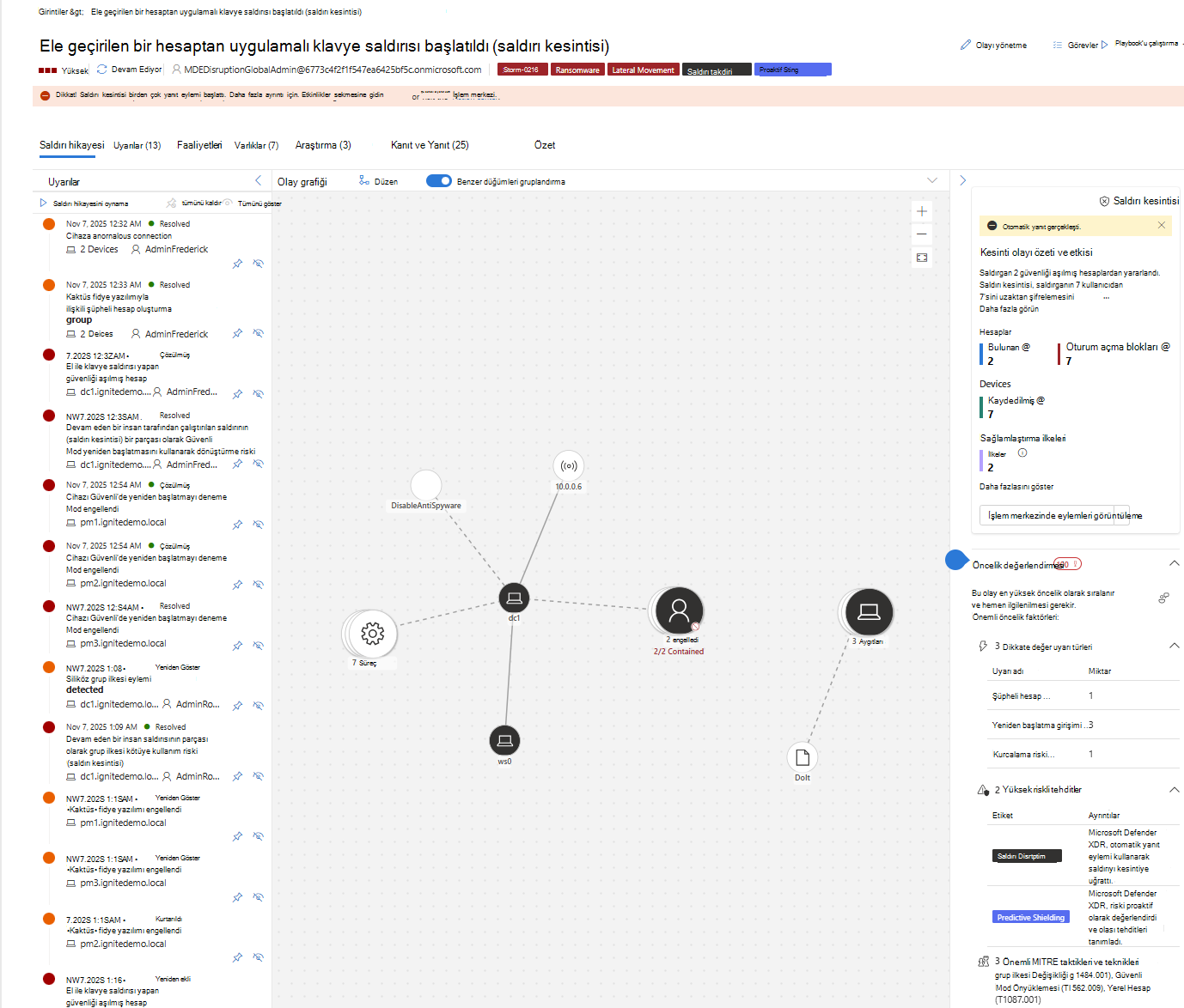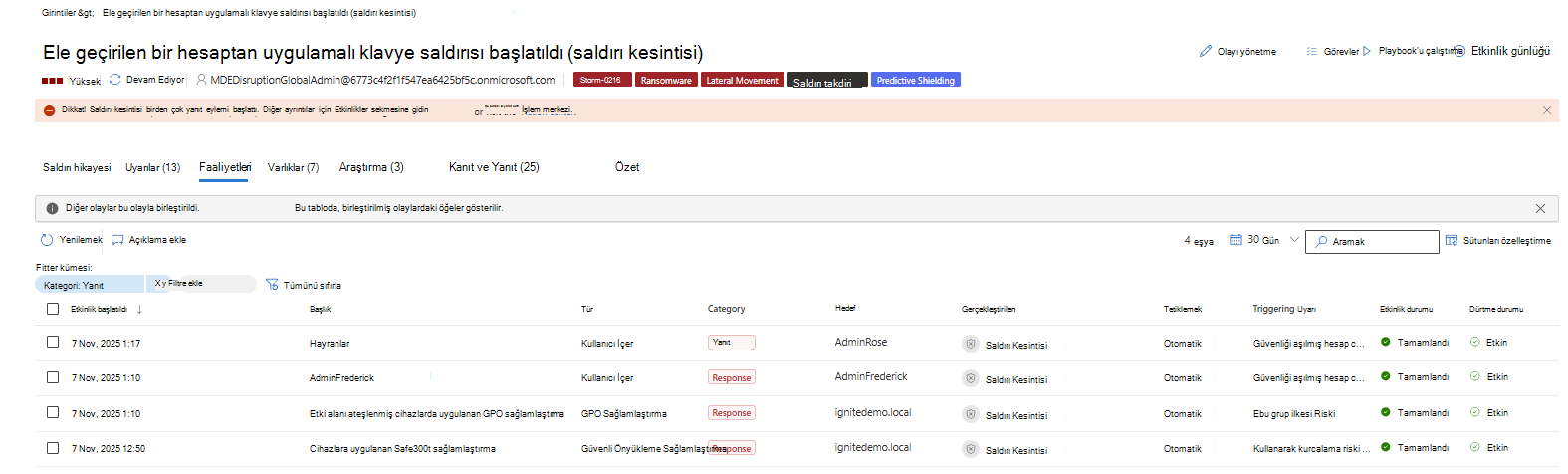 Etkinlikler sekmesinde geçerli olaya özgü eylemler görüntülenirken, İşlem merkezi tüm etkinleştirmeleri görüntüler. İşlem merkezindeki tahmine dayalı koruma eylemlerini izlemek için bkz. İşlem merkezini kullanma.