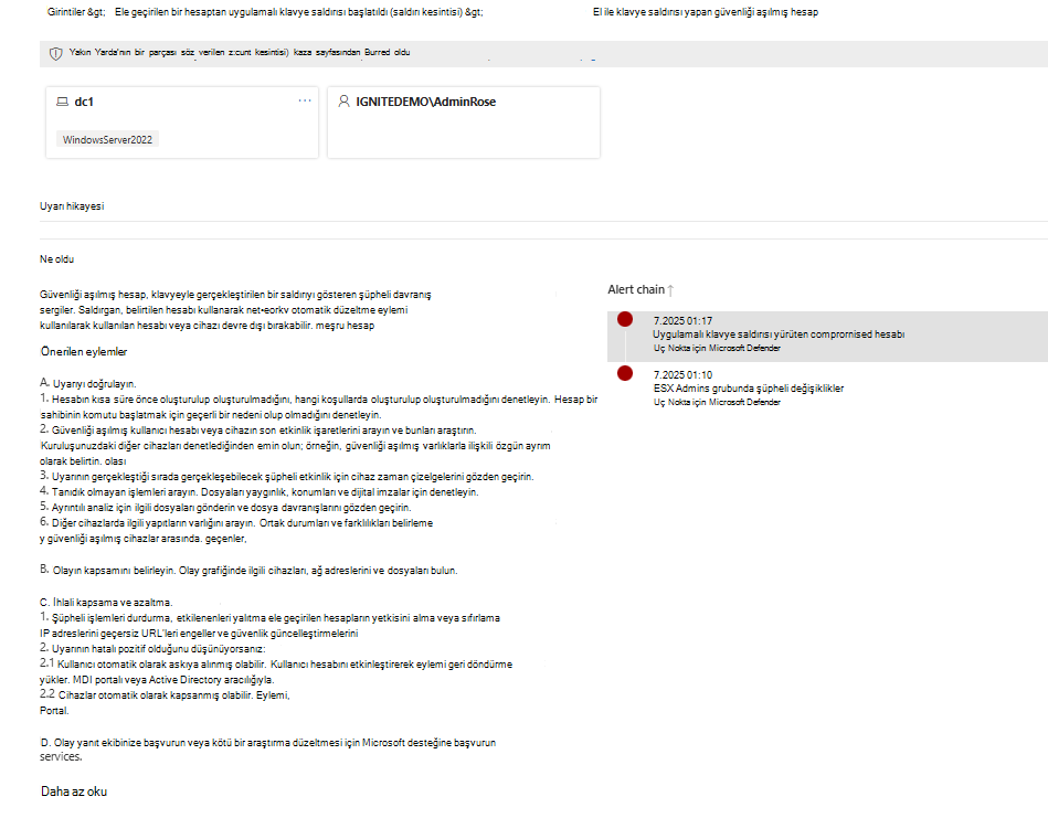 Güvenlik içgörülerini geliştirmek ve kapsamı genişletmek için Kimlik için Microsoft Defender algılayıcısını kullanmanızı öneririz. Bu yaklaşım uyarılara kullanıcı adları, Active Directory ayrıntıları ve grup üyelikleri gibi meta verileri ekleyip bunları daha eyleme dönüştürülebilir hale getirir.