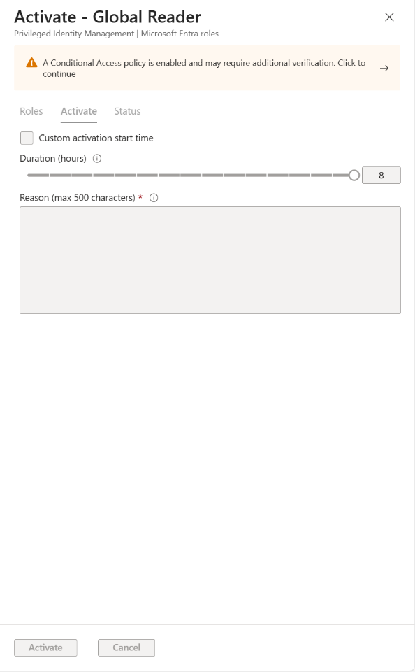 Kullanıcı, kimlik doğrulama bağlamıyla yapılandırılmış uygun bir rolü etkinleştirdiğinde şu iletiyi görür: "Koşullu Erişim ilkesi etkinleştirildi ve ek doğrulama gerektirebilir. Devam etmek için tıklayın." Daha sonra kullanıcı, Koşullu Erişim ilkesi tarafından tanımlanan yeniden kimlik doğrulamasını tamamlamaya yönlendirilir.