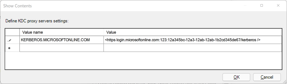 your_Microsoft Entra_tenant_iddeğerini Microsoft Entra kiracı kimliğiniz ile değiştirin. Değer eşlemesinde, https'den sonra ve kapanış / öncesinde bir boşluk görüntülenir.Değer adı Değer KERBEROS.MICROSOFTONLINE.COM https login.microsoftonline.com:443:your_Microsoft Entra_tenant_id/kerberos /İçeriği Göster iletişim kutusunu kapatmak için Tamam'ı seçin.