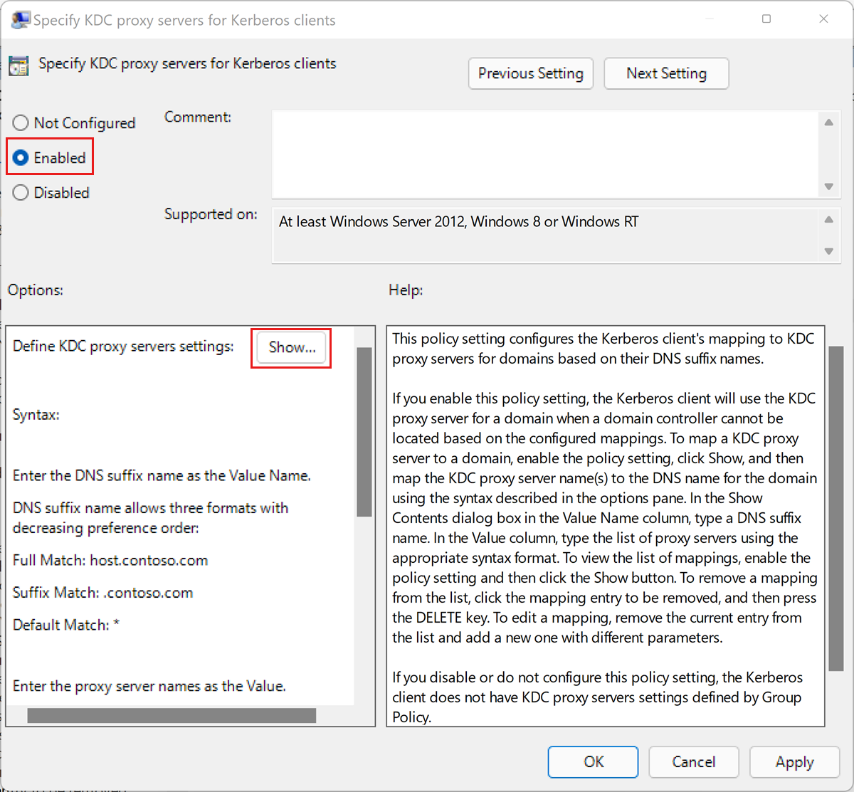 Kerberos istemcileri için KDC proxy sunucularını belirtin iletişim kutusunda Uygula'yı seçin.