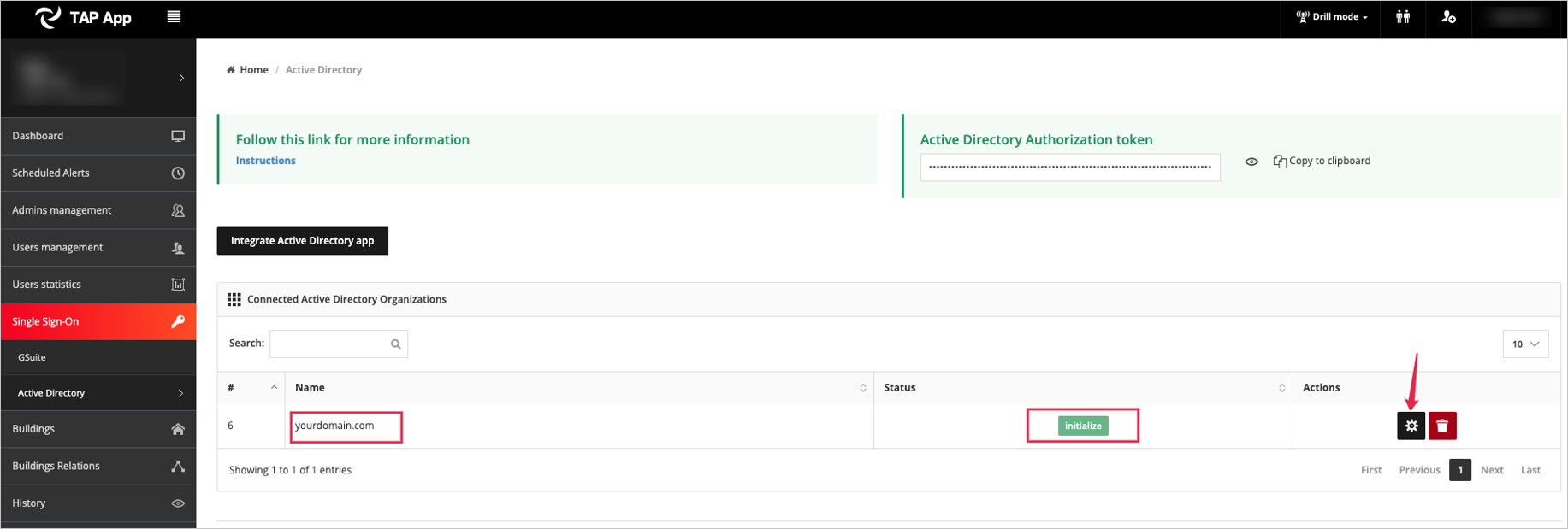 Active Directory uygulamasını tümleştir düğmesini seçin. Ardından kuruluşunuzun etki alanını girin ve Kaydet düğmesini seçin.