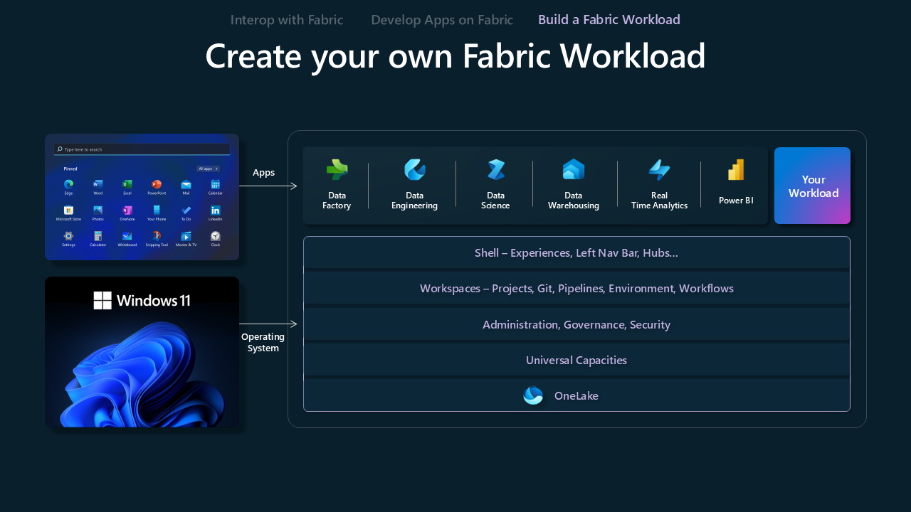Microsoft Fabric İş Yükü Geliştirme Seti, geliştiricilerin uygulamaları Microsoft Fabric hub'ına tümleştirmesi için kapsamlı bir araç seti sunar. Bu tümleştirme, doğrudan Doku çalışma alanı içinde yeni özelliklerin eklenmesine olanak sağlayarak kullanıcılar için analiz yolculuğunu geliştirir. Geliştiricilere ve ISV'lere müşterilere ulaşmak için yeni bir yol sağlar, hem tanıdık hem de yeni deneyimler sunar ve mevcut veri uygulamalarından yararlanılır. Fabric yöneticileri, bir kuruluşta iş yükleri ekleyebilecek kişileri yönetebilir.