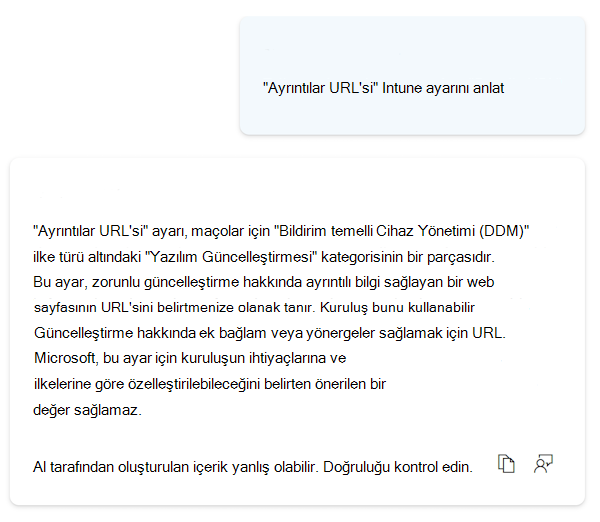Intune'da da Microsoft Copilot kullanabilirsiniz. Copilot özelliklerini ayarlar kataloğuyla kullandığınızda Copilot'ı kullanarak şunları yapabilirsiniz: