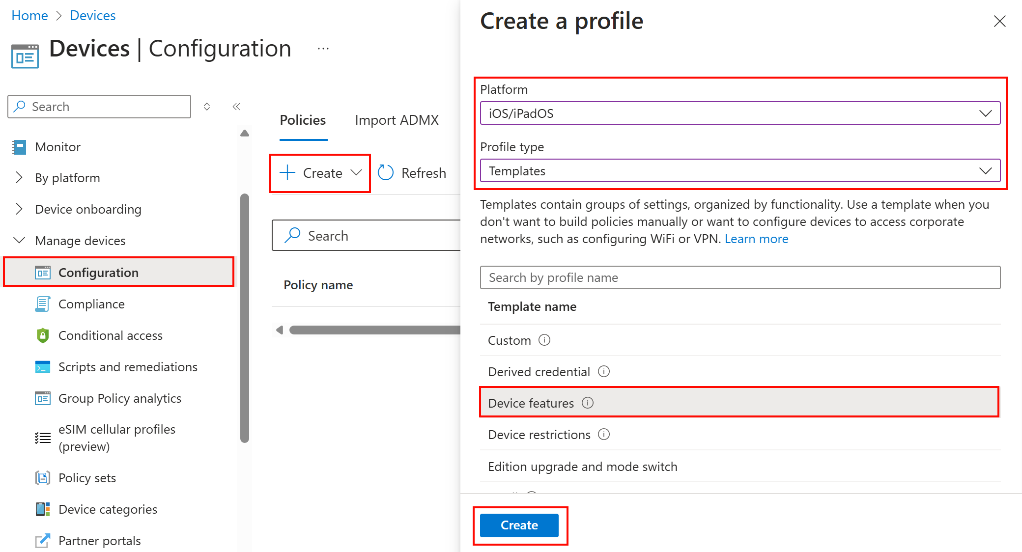 - Profil türü: Şablonlar>Cihaz özellikleri'ni seçin.