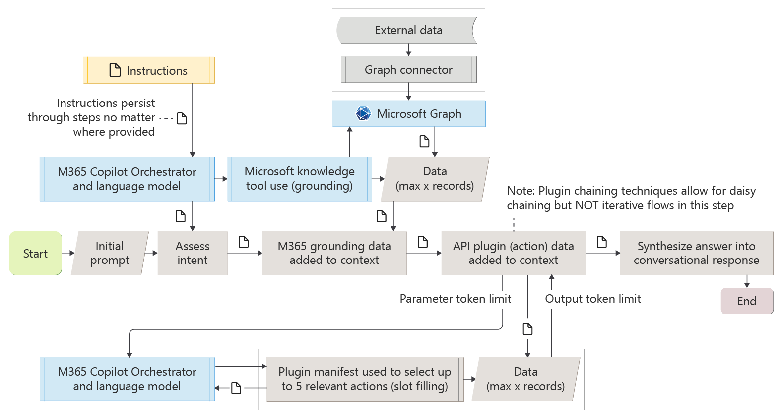 Developers control components like instructions, knowledge and data sources, and API plugins. Because Microsoft grounding and calls to external tools happen sequentially, you can't use chained operations with grounding data or looped operation plans. This architecture isn't suitable for complex multistep operations.