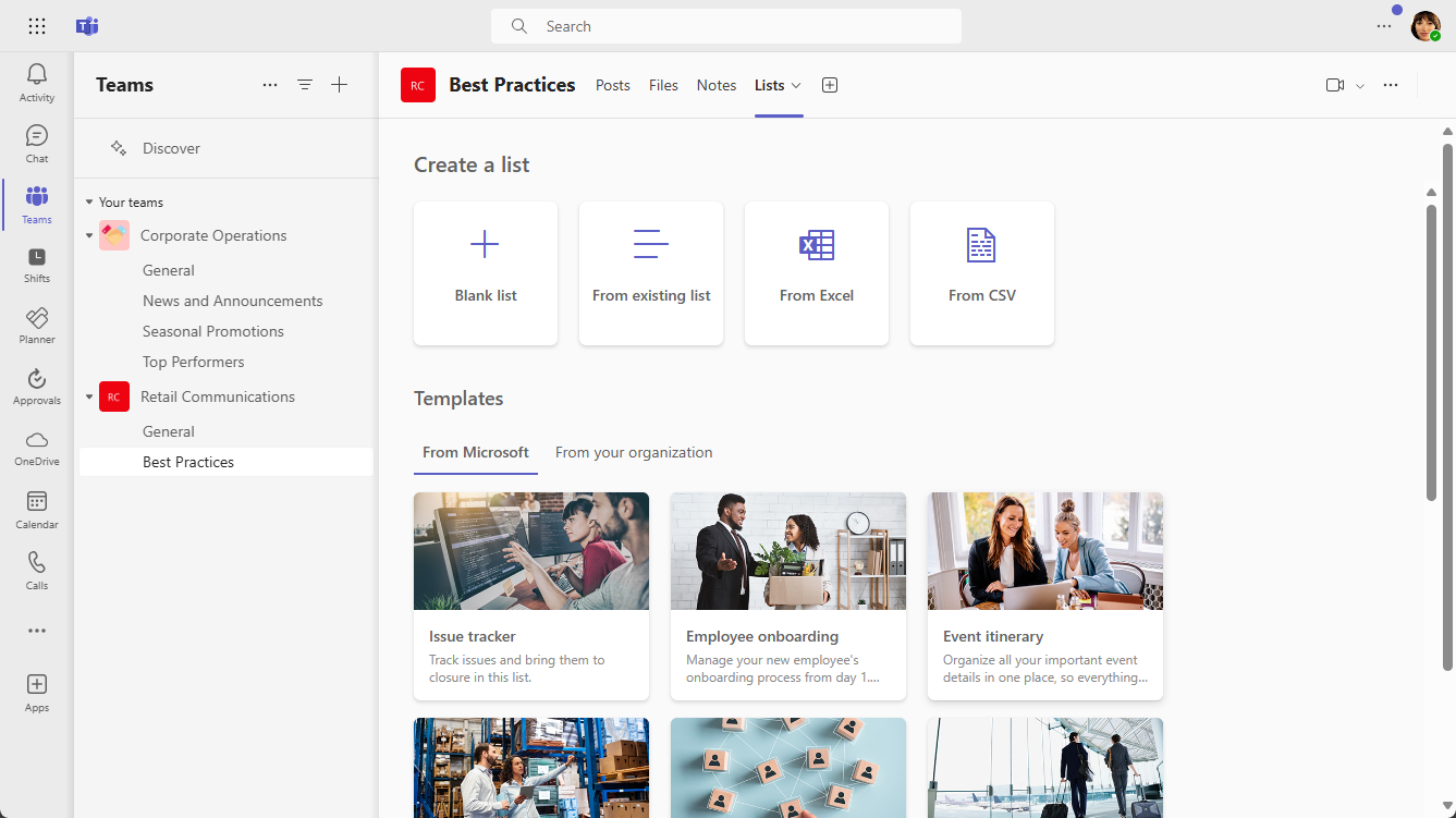 The Lists app in Microsoft Teams helps users in your organization track information, organize work, and manage workflows. With Lists, users can track data such as issues, assets, routines, contacts, inventory, incidents, loans, patients, and more. Users do this by using customizable views, rules, and alerts to keep everyone on the team in sync. The Lists app is available in Teams desktop, web, and mobile clients.