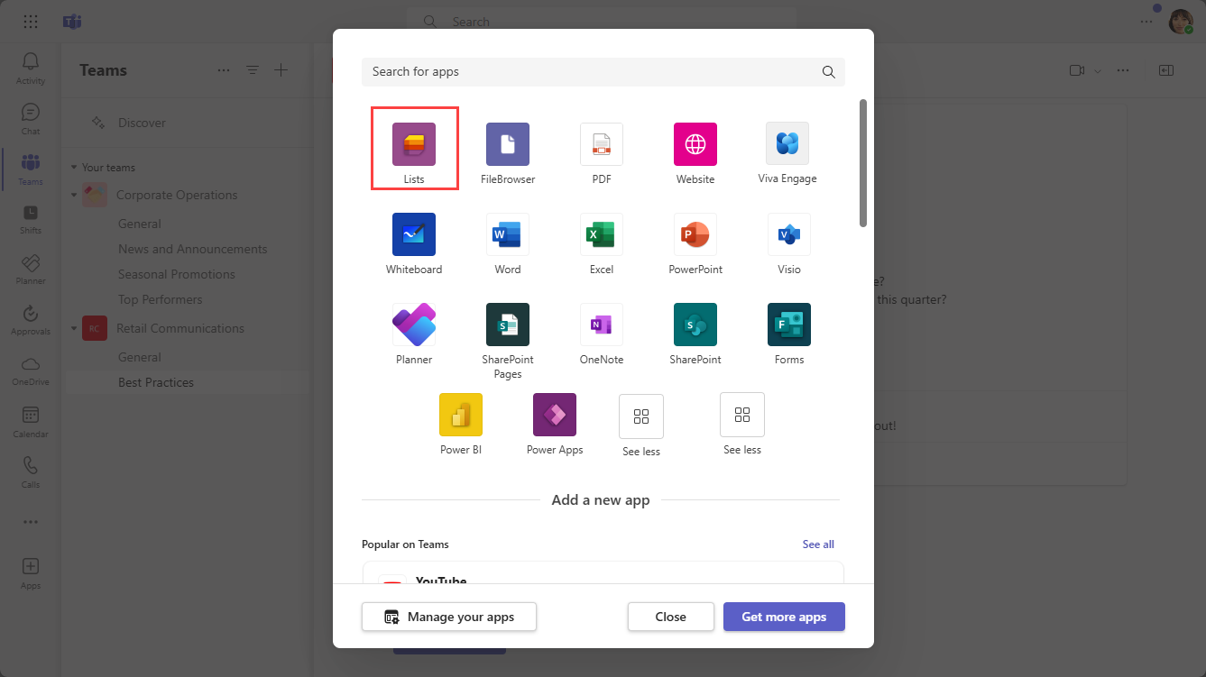 Lists is available in every team and channel