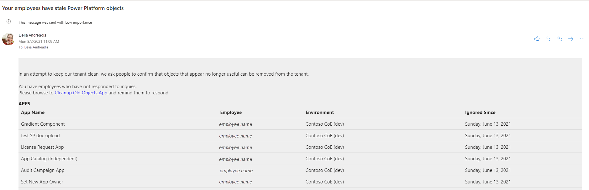 Son altı ay içinde değiştirilmeyen veya başlatılmayan uygulamaları denetler (yapılandırılabilir) ve uygulama sahibinden (akış onayları aracılığıyla) uygulamanın silinip silinemeyeceğini sorar.