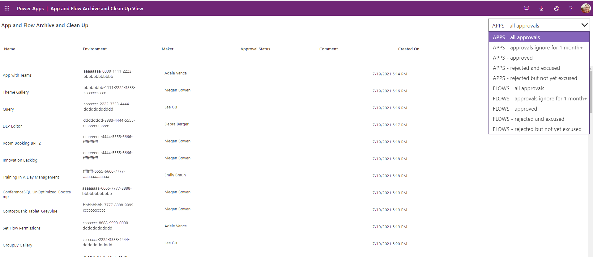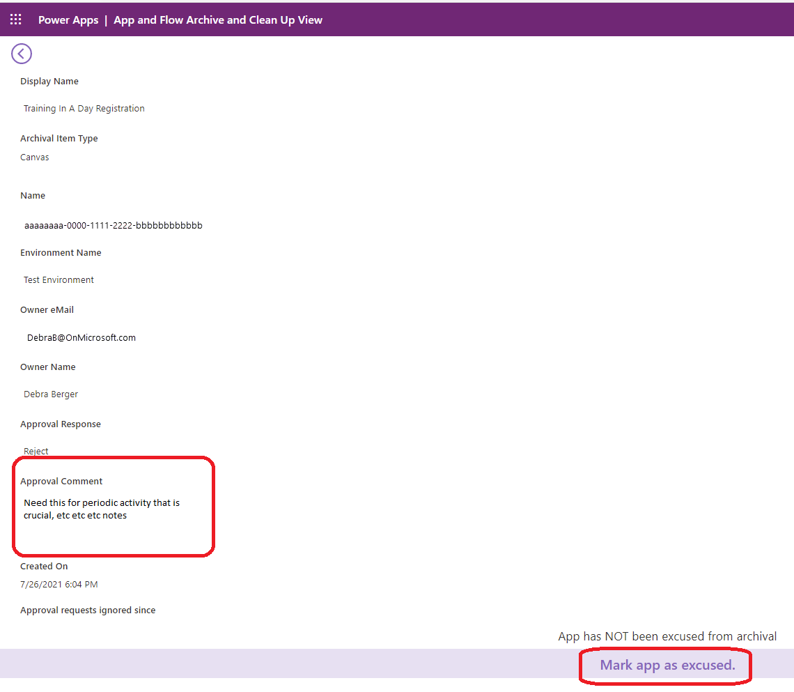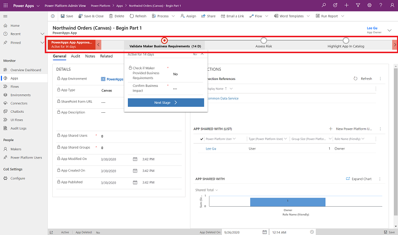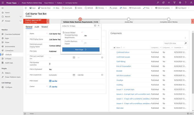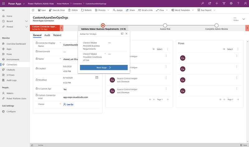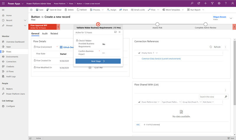 Bu uygulama, kullanıcıların sahip oldukları uygulamaların, akışların, sohbet botlarının veya özel bağlayıcıların uyumlu olup olmadığını denetlemek için denetim sürecinde kullanılır. Ayrıca, CoE yöneticilerine uyumluluğu sağlamak için iş gerekçesi sunmanın bir yolu olarak bilgi göndermek için de kullanılır.