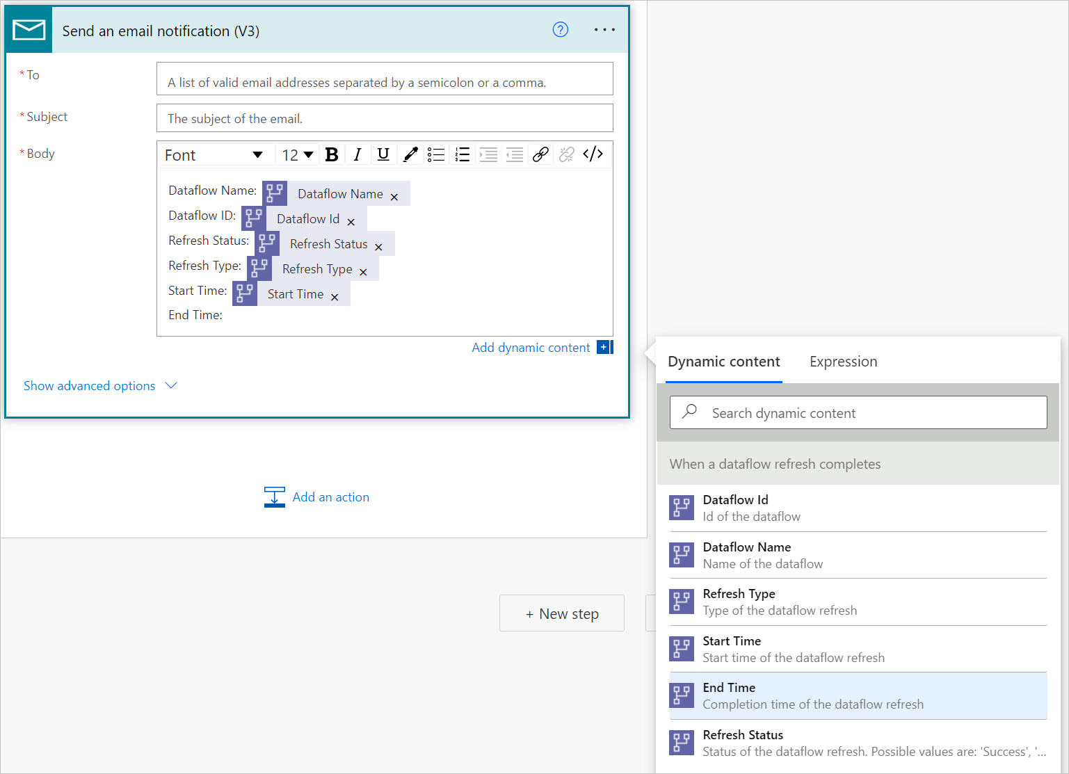 E-postanın gövdesinin içinde Gövde'nin yanındaki alanı seçin ve e-postanızın içeriğine veri akışı bilgileri eklemek için Dinamik içerik'i kullanın.
