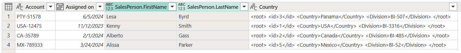 { "id" : 249319, "FirstName": "Lesa", "LastName": "Byrd" }Ülke— Aşağıdaki örnekte olduğu gibi, hesabın atandığı Ülke ve Bölüm hakkındaki bilgileri içeren ayrıştırılmamış XML metin dizeleri içerir.