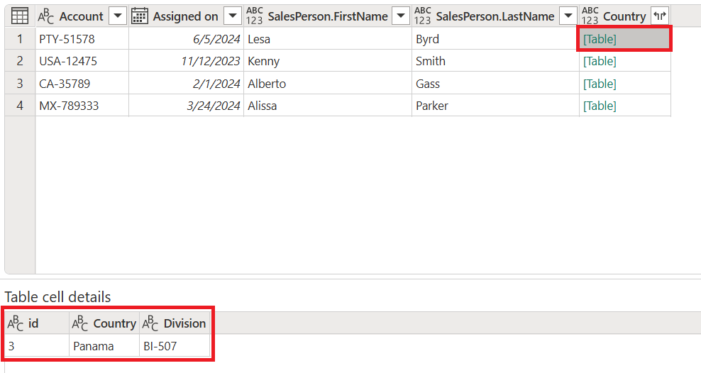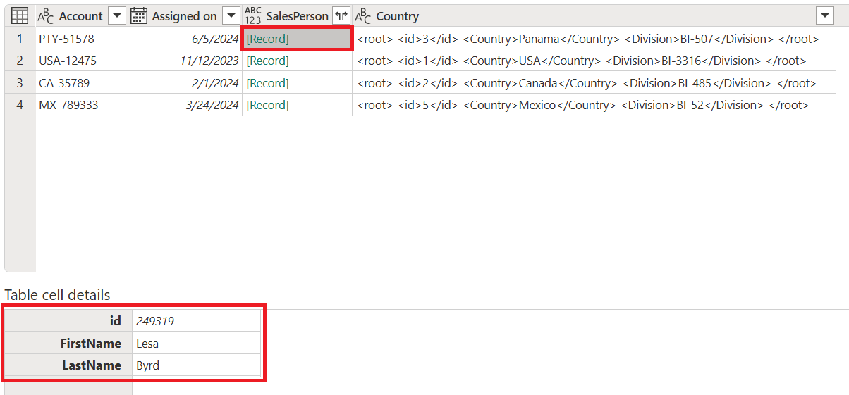 SalesPerson sütununu seçin. Ardından Dönüştür sekmesinin içindeki Ayrıştır açılan menüsündeN JSON'ı seçin. Bu adımlar SalesPerson sütununu metin dizelerine sahip olmaktan Kayıt değerlerine dönüştürür. Ekranın alt kısmındaki kayıt içeriğinin ayrıntılı önizlemesini almak için Kayıt değerinin hücresindeki boşlukta herhangi bir yeri seçebilirsiniz.