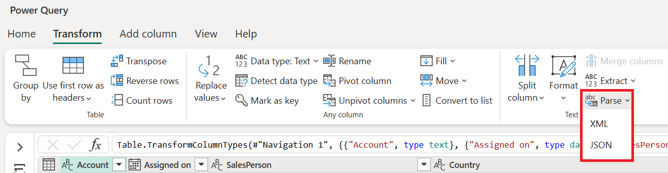 Power Query'de, içeriği JSON veya XML metin dizesi olarak tanımlayarak bir sütunun içeriğini metin dizeleriyle ayrıştırabilirsiniz.