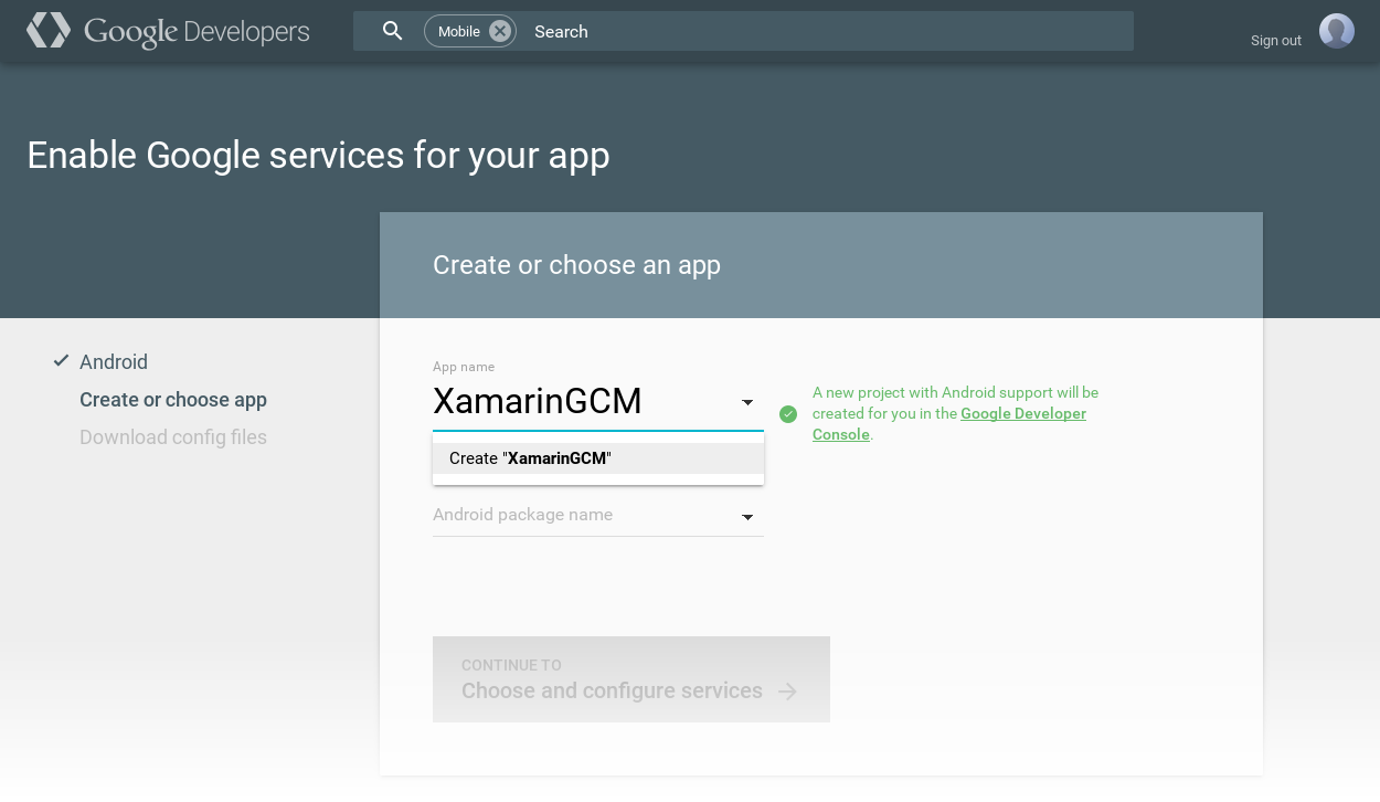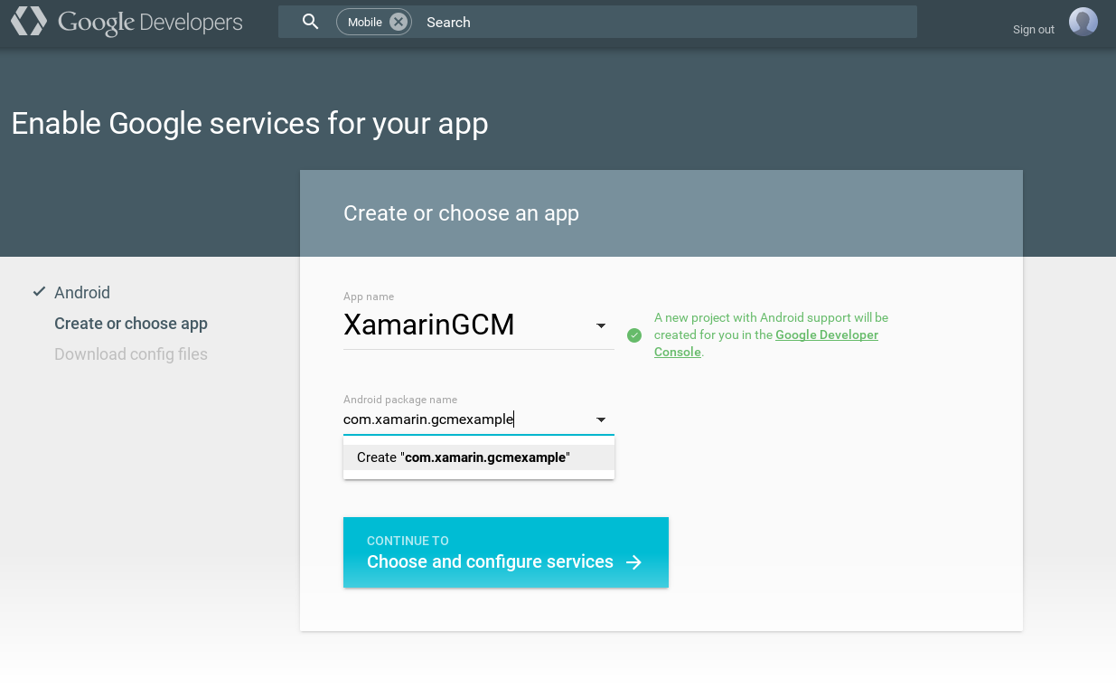 Ardından, uygulamanızın paket adını girin (bu örnekte paket adı com.xamarin.gcmexample'dır) ve Devam'a tıklayarak Hizmetleri seçin ve yapılandırın: