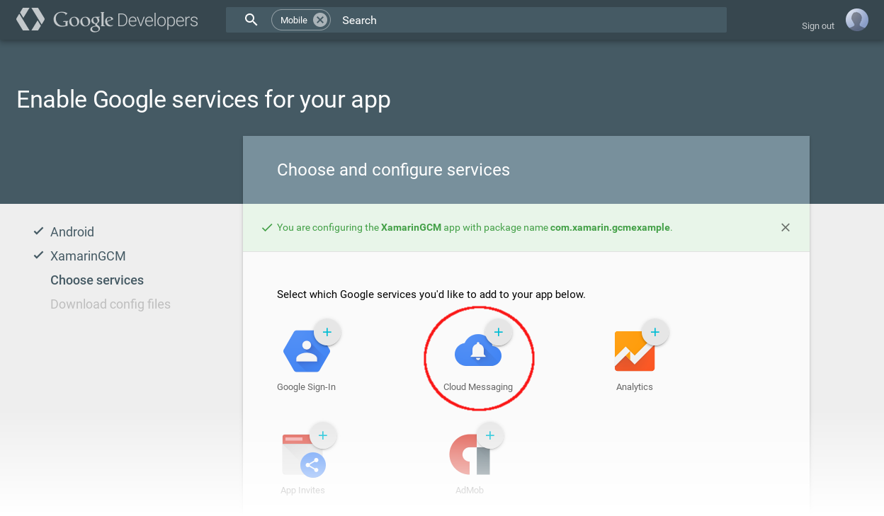 Hizmetleri seçin ve yapılandırın bölümünde, uygulamanıza ekleyebileceğiniz Google hizmetleri listelenir. Cloud Messaging'e tıklayın: