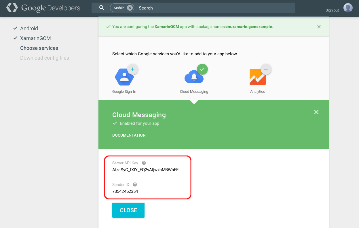 Uygulamanız için bir Sunucu API anahtarı ve Gönderen Kimliği oluşturulur. Bu değerleri kaydedin ve KAPAT'a tıklayın: