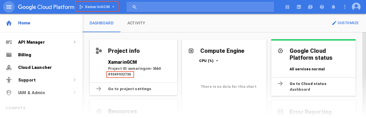 İstediğiniz zaman Google Bulut Konsolu'nda oturum açıp projenizi seçerek proje ayarlarınızı görüntüleyebilirsiniz. Örneğin, sayfanın üst kısmındaki açılır menüden projenizi seçerek Gönderen Kimliğini görüntüleyebilirsiniz (bu örnekte projeye XamarinGCM adı verilir). Gönderen Kimliği, bu ekran görüntüsünde gösterildiği gibi Proje numarasıdır (buradaki Gönderen Kimliği 9349932736):