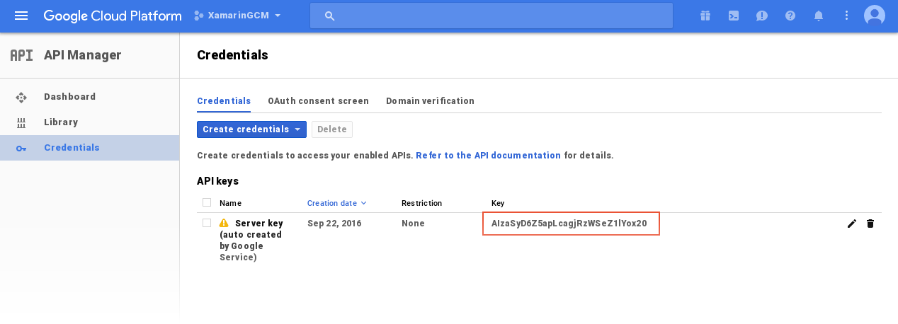Google Cloud Messaging'i Ayarlama (bu kılavuzun ilerleyen bölümlerinde), proje oluşturma ve bu kimlik bilgilerini oluşturma hakkında ayrıntılı yönergeler sağlar.