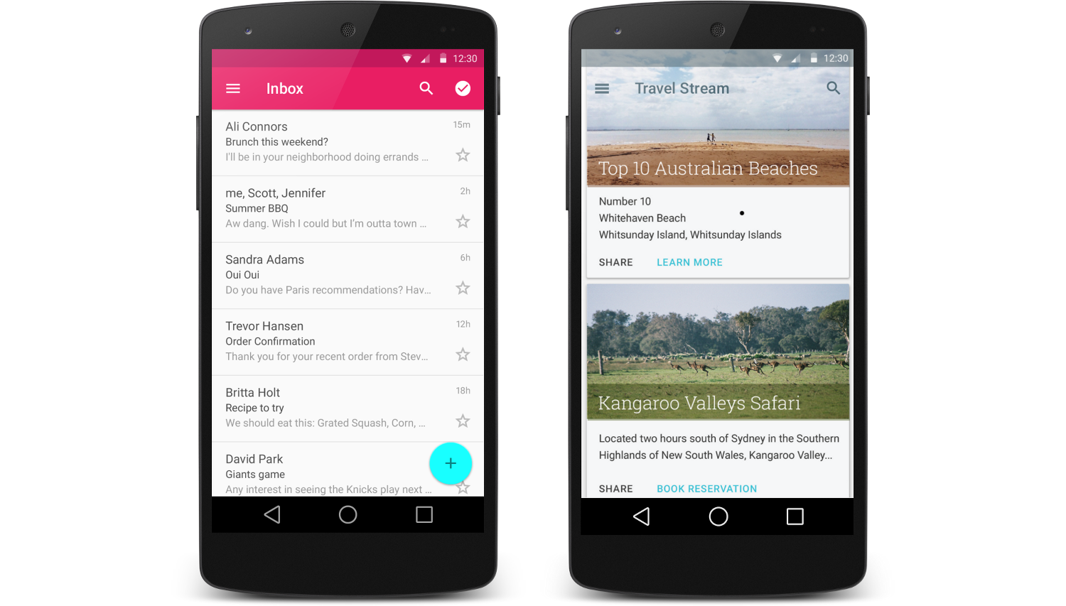 Yeni Android 5.0 Malzeme Teması, Android kullanıcı arabiriminin görünümüne ve görünümüne yepyeni değişiklikler getiriyor. Görsel öğeler artık kalın grafikleri, tipografiyi ve baskı tabanlı tasarımın parlak renklerini alan dokunsal yüzeyleri kullanıyor. Malzeme Teması örnekleri aşağıdaki ekran görüntülerinde verilmiştir: