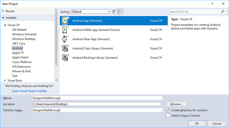 İlk adım yeni bir Xamarin.Android projesi oluşturmaktır. Visual Studio'yu başlatın, Yeni Proje...'ye tıklayın ve Visual C# > Android Android > Uygulaması (Xamarin) şablonunu seçin. Yeni uygulamayı Tasarım Aracı Walkthrough olarak adlandırın ve Tamam'a tıklayın.