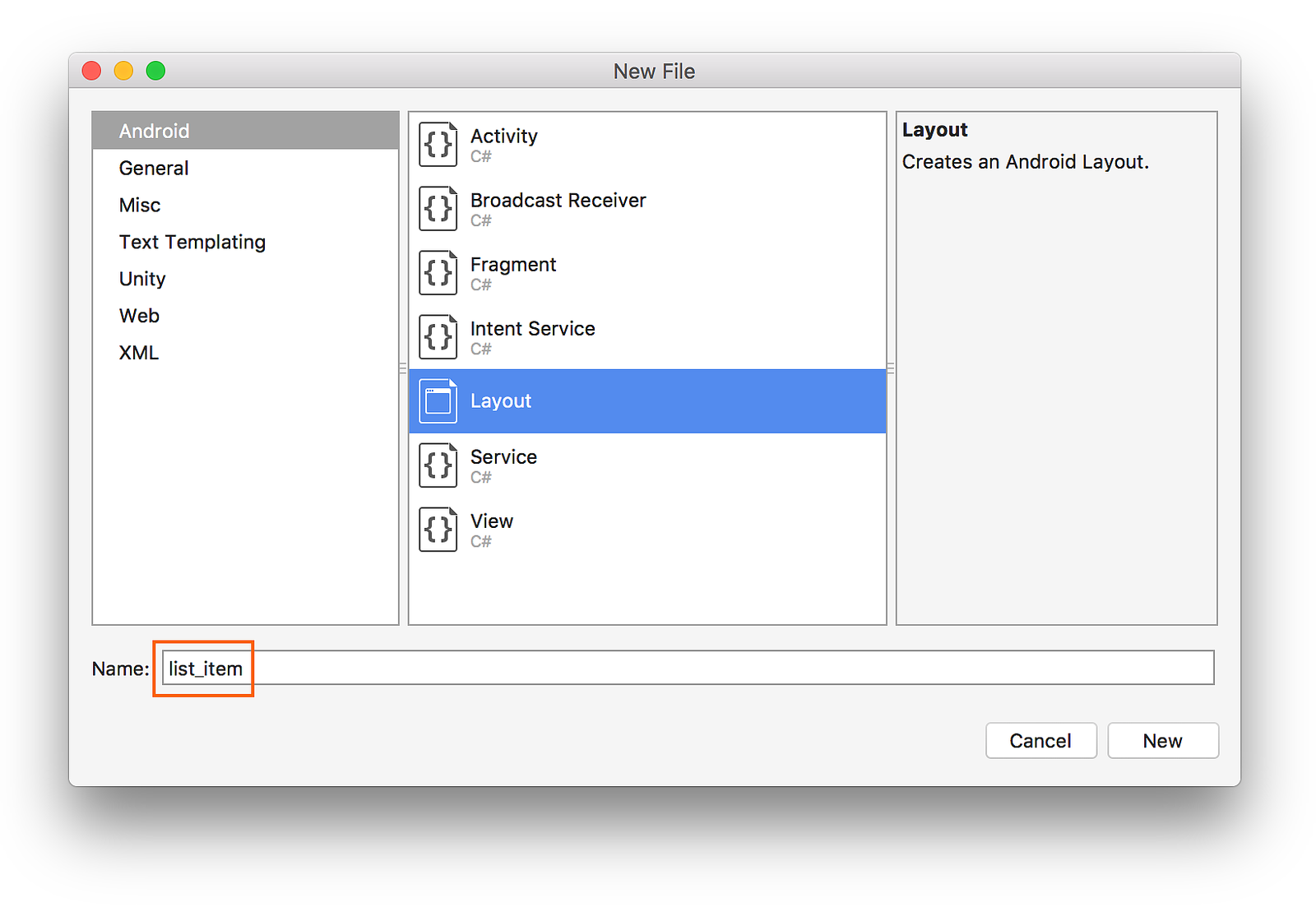 Sonraki adım, kullanıcı arabirimi öğelerini barındıracak bir LinearLayout oluşturmaktır. Çözüm Gezgini Kaynaklar/düzen'e sağ tıklayın ve Yeni Öğe Ekle...'yi > seçin. Yeni Öğe Ekle iletişim kutusunda Android Düzeni'ni seçin. Dosyayı list_item adlandırın ve Ekle'ye tıklayın: