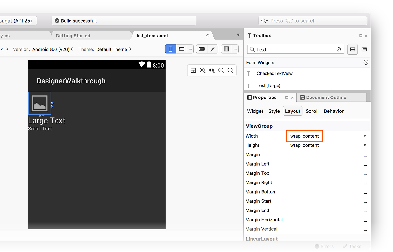 Üçgene yeniden tıklanması ayarı olarak Width match_parentdöndürür. Ardından, Belge Ana Hattı bölmesine gidin ve kök LinearLayoutöğesini seçin: