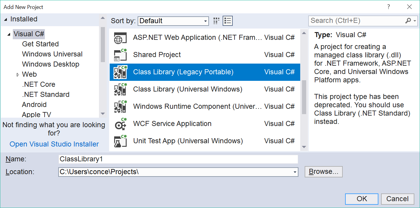 Taşınabilir Sınıf Kitaplıkları Visual Studio'nun en son sürümünde kullanım dışı bırakılmıştır ve bunun yerine .NET Standart Kitaplıkları önerilir.