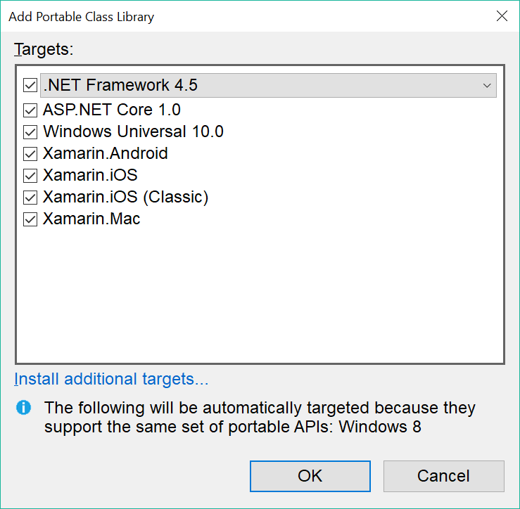 Xamarin sütunu, Xamarin.iOS ve Xamarin.Android'in Visual Studio ile birlikte gelen tüm profilleri desteklediğini yansıtır ve oluşturduğunuz tüm kitaplıklardaki özelliklerin kullanılabilirliği yalnızca desteklemeyi seçtiğiniz diğer platformlarla sınırlandırılır.