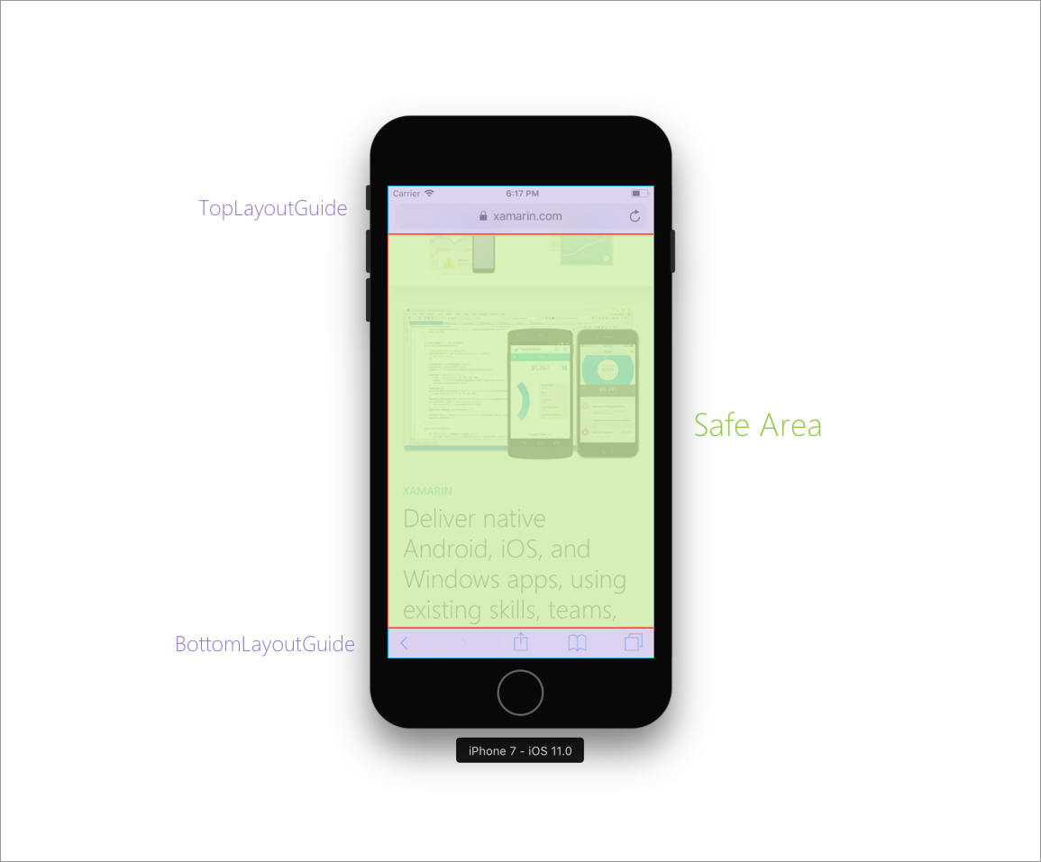 iOS 7, görünümlerinizi UIKit çubukları tarafından gizlenmeyecek ve ekranınızın görünür bir alanında olacak şekilde kısıtlamanın bir yolu olarak tanıtıldı topLayoutGuide bottomLayoutGuide. Bunlar iOS 11'de güvenli alan için kullanım dışı bırakılmıştır.