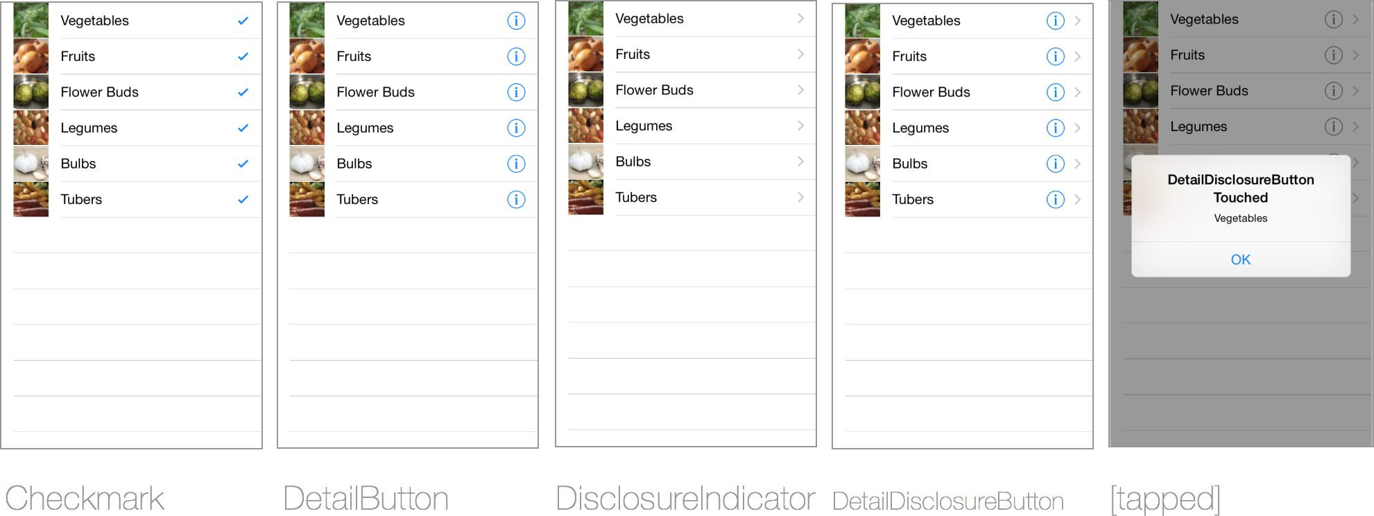 - DetailButton : Dokunmaya hücrenin geri kalanından bağımsız olarak yanıt verir ve hücrenin kendisine dokunmak için farklı bir işlev gerçekleştirmesine olanak tanır (örneğin, bir açılan pencere veya yığının parçası olmayan yeni bir