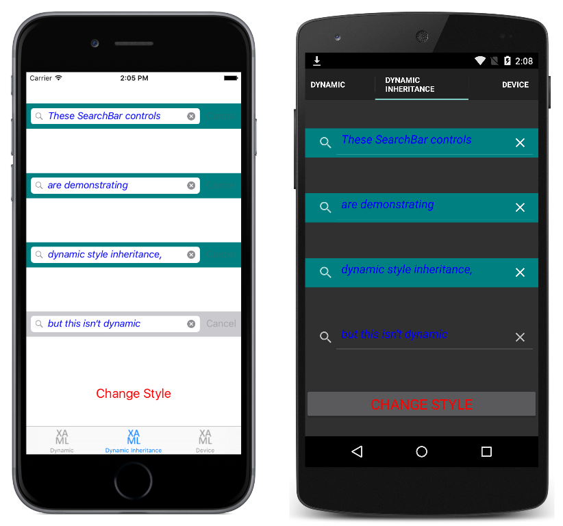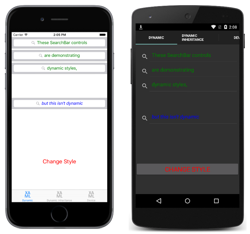 Arka planda kod dosyasında oluşturucu, dinamik stilleri gösteren önceki örnekte olduğu gibi anahtarıyla searchBarStylebir ResourceDictionary girdi oluşturur. OnButtonClicked Olay işleyicisi yürütürken ile searchBarStyle greenSearchBarStylearasında blueSearchBarStyle geçiş yapacaktır. Bu, aşağıdaki ekran görüntülerinde gösterilen görünüme neden olur: